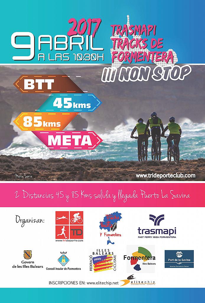 si nos envías por email, info@trideporteclub.com el DNI y eres residente el certificado del ayuntamiento te gestionamos tu traslado a Formentera. REGLAMENTO DEFINICIÓN 1. El Club Trideporte, organiza la Trasmapi Tracks de Formentera III Non Stop. 2. Trasmapi Tracks de Formentera III Non Stop es una prueba competitiva, que se llevará a cabo el 09 de abril en la isla de Formentera de 85km y 45km y con 1100 mts. de desnivel positivo. 3. Tendrá dos pruebas: Bronce y Silver 4. La prueba Silver tendrá la salida y llegada en el Puerto de La Savina y sigue el itinerario de la Tracks de Formentera en su mayor parte. Y tendrá las 6 categorías de la Challengue Pitiusa. 7. El Club Trideporte por anticipado se excusa de los errores que pueda tener 8. La organización se reserva el derecho de cambiar puntos de la presente normativa antes y durante la celebración del evento, para el buen desarrollo del mismo. FECHAS 2. La salida oficial de la prueba será el domingo 09 de abril de 2017 a las 10:30 horas, en el puerto de La Savina de la categoría Silver y la prueba bronce a las 12h desde San Francesc. 3. El cierre oficial de la prueba será el 9 de abril de 2017 a las 16:30 horas, el puerto de La Savina 4. La entrega de trofeos será a las 14:45 en el Puerto de la Savina. Nos dará tiempo a coger el barco de las 15:30 de Trasmapi INSCRIPCIÓN 1. La inscripción previa a la prueba es obligatoria para poder participar. Por este motivo está totalmente prohibida la participación sin la inscripción. La organización de la Trasmapi Tracks de Formentera III Non Sto no se hace responsable de las personas que realicen la prueba sin previa inscripción. 2. La inscripción se puede formalizar en elitechip.net 4. El precio de la inscripción incluye un maillot hasta el 9 de marzo, el track del recorrido, avituallamientos sólidos y líquidos durante la prueba, dorsal, servicio técnico durante la marcha, asistencia médica durante el recorrido, licencia federativa para los participantes no federados. 7. Política de cancelación de la inscripción. La organización se compromete a devolver el importe íntegro de la inscripción hasta el 15 de marzo, siempre y cuando el participante formalice una previa solicitud por escrito de cancelación. Después de esta fecha y hasta el 1 de abril, las cancelaciones tendrán un gasto del 50% del importe de la inscripción. Cualquier cancelación solicitada a partir del 1 de abril, la organización no devolverá el importe de la inscripción para los gastos ya generadas. PARTICIPACIÓN 3. El Club Trideporte pone a disposición de los participantes no federados la contratación de la licencia federativa que les cubra el día de la prueba. 6. La organización se reserva el derecho de admisión. RECORRIDO 1. El único recorrido válido es el descrito por la organización. La forma de seguimiento del itinerario será mediante track de GPS; el cual se enviará a todos los participantes unos días antes de la prueba. Saltarse alguna parte del recorrido significará la descalificación. 2. La organización tendrá a disposición vehículos (motos) para la apertura del recorrido de la etapa y ciclista escoba por el cierre del recorrido, pudiendo así atender cualquier incidencia. 3. La organización establecerá una hora máxima de paso al último avituallamiento (comentadas en el briefing), en el caso de llegar en el límite o por encima de esa hora, la organización tiene el derecho y deber de pedir al participante el abandono. 4. Es obligatorio el seguimiento del recorrido establecido por la organización de la Trasmapi Tracks de Formentera III Non Stop Este recorrido es exclusivo para los participantes de la Trasmapi Tracks de Formentera III Non Stop. 5. Trasmapi Tracks de Formentera III Non Sto no se hace responsable de cualquier participante que exceda de los límites del recorrido; y este se hará plenamente responsable de cualquier incidente o lesión sobre ellos mismos o en terceros. 6. A lo largo del recorrido habrá puntos de avituallamientos y puntos de control (en los que se debe firmar), en el que todos los participantes están obligados a pasar. 7. El recorrido estará abierto al tráfico de vehículos, peatones, a la libre circulación de animales y vehículos agrarios. Por tanto, el participante debe respetar las normas de circulación, y se convertirá en el máximo responsable de las imprudencias e infracciones que pueda cometer. 8. La organización se reserva el derecho de modificar el recorrido, distancias, desniveles y avituallamientos de la marcha si lo considera necesario. FUNCIONAMIENTO DE LA PRUEBA 1. Es obligatorio el uso del casco protector homologado, llevar herramientas y recambio adecuado, ropa de ciclista adecuada a las condiciones meteorológicas y teléfono móvil durante toda la marcha. 4. La organización dispone de servicios de asistencia médica. ABANDONO DE LA PRUEBA 1. Cualquier participante que abandone la prueba, lo comunicará a la organización lo antes posible. 3. La organización se reserva el derecho de cancelar la Trasmapi Tracks de Formentera III Non Stop en caso de condiciones meteorológicas adversas.